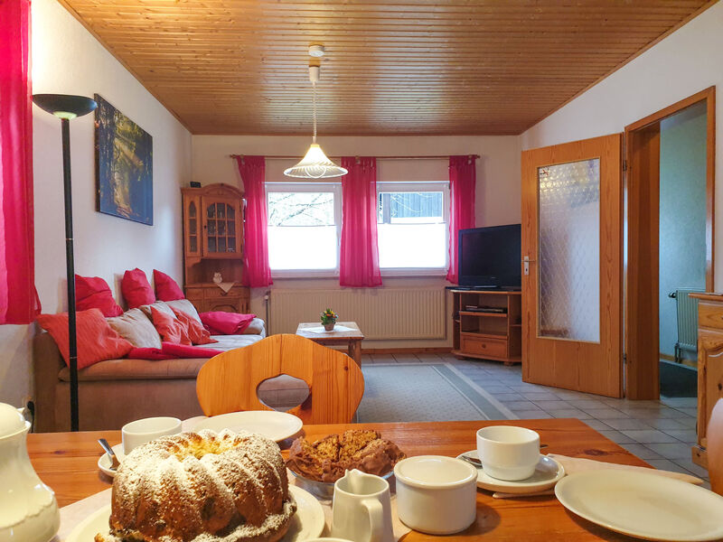 "Haus Tausendschön", huis 3-kamers 70 m2, op de begane grond. Comfortabel en gezellig ingericht: woon-/eetkamer 25 m2 met Sat-TV (Flatscreen TV), CD-speler en DVD. 2 kamers 9 m2, elke kamer heeft 2 bedden (90 cm, lengte 200 cm). Open keuken 6 m2 (4-pits kookplaat, oven, afwasmachine, magnetron, diepvriezer, elektrische koffiemachine). Douche/WC. Gas-verwarming. Klein terras 6 m2 gedeeltelijk overdekt, tuin 300 m2, gazon 250 m2. Terrasmeubelen, barbecue, bergruimte. Ter beschikking: kinderstoel, haardroger. Internet (Internet (WiFi), gratis). Parkeerplaats. Rookvrij huis. Maximaal 1 huisdier/hond toegestaan. Rookmelders.